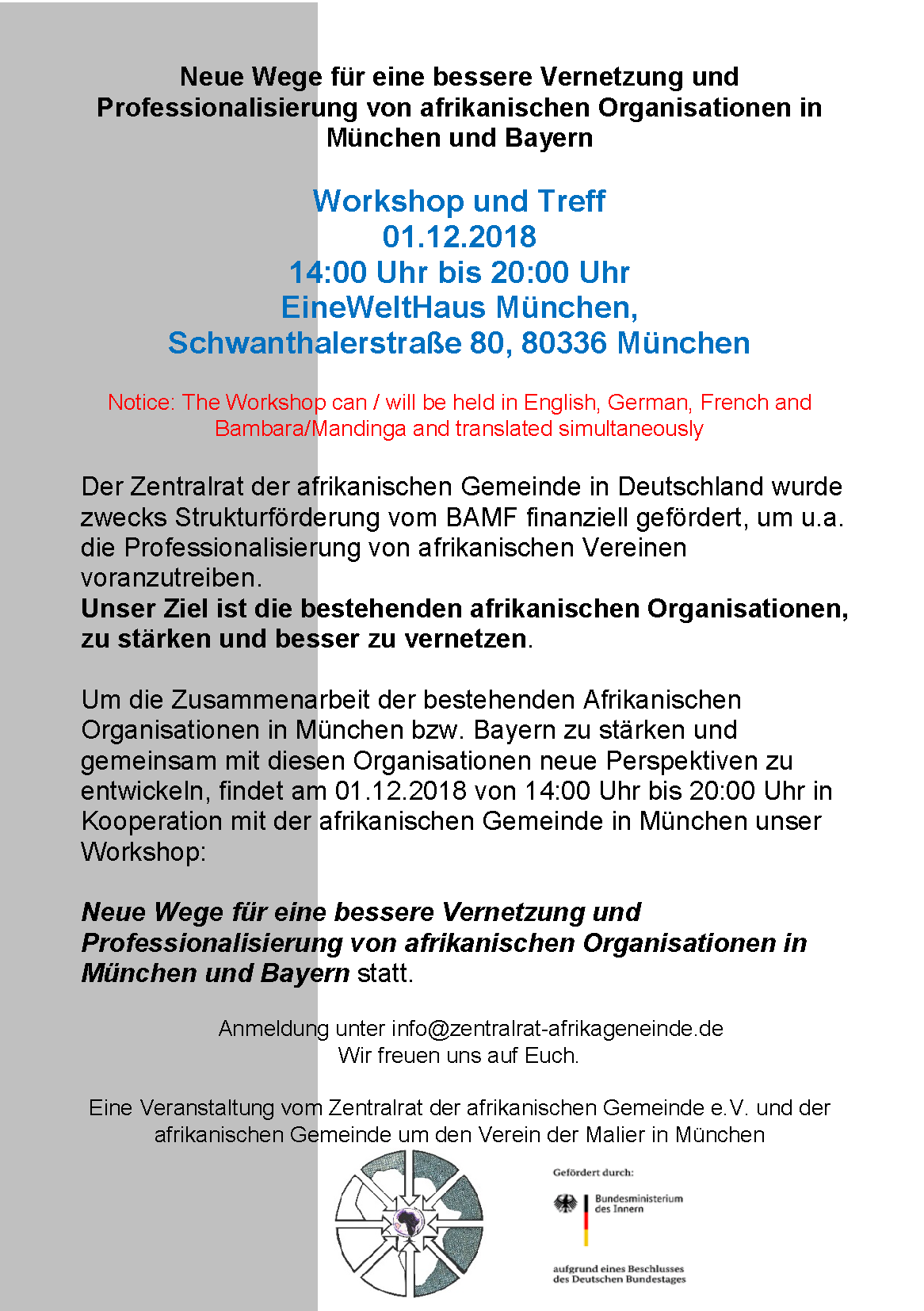 Der Zentralrat der afrikanischen Gemeinde in Deutschland hat vor allem die Aufgabe, die politischen und soziokulturellen Belange von Menschen mit afrikanischem Hintergrund nach Außen zu vertreten. Darüber hinaus setzt er sich intensiv für die Stärkung der Integration von Menschen afrikanischer Herkunft bzw. mit afrikanischem Hintergrund das gegenseitige Verständnis von ihnen und Menschen anderer Kulturen ein.